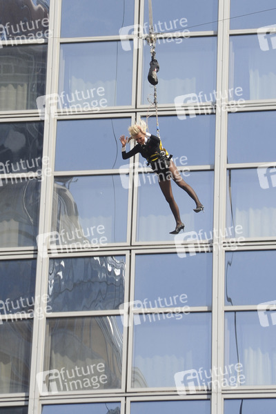 Playboy Playmate Base Flying vom Dach des Park Inn Hotels am Alexanderplatz, Berlin