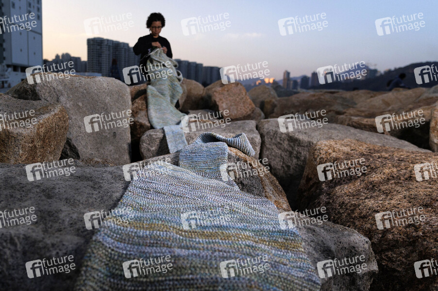 Mona Chen mit ihrem Kunstwerk Body Container an der Grenze von Hongkong zu Festlandchina. Sie ist eine international anerkannte Künstlerin aus Hongkong, die mit ihrer charakteristischen Technik des Verstrickens von geschredderten Texten Verbindungen über Grenzen hinweg herstellt und weggeworfene Materialien in tragbare Skulpturen verwandelt. Ihre Arbeiten kombinieren Elemente aus Mode, Performance und Skulptur. Hongkong, 12.02.2024