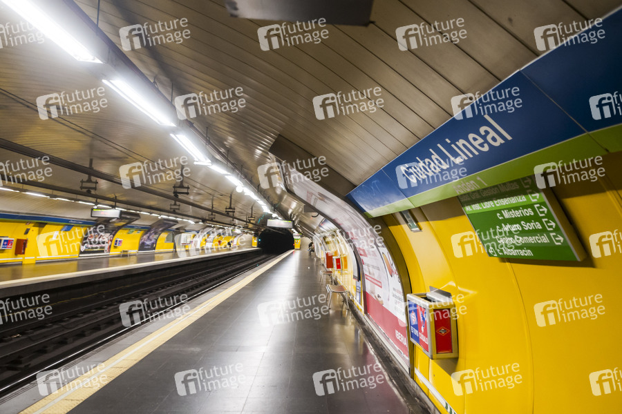 Leere U-Bahn Station am Tag 17, nachdem die spanische Regierung den Ausnahmezustand wegen des Coronavirus COVID-19 erklärt hat. Die Bevölkerung steht vorerst bis zum 11. April Tage zu Hause unter Quarantäne. Die spanische Polizei und Armee überprüfen Menschen, die durch die Straßen gehen. Erlaubt sind Gänge in Krankenhaus, in Supermärkte, Kioske und Apotheken, sowie das Ausführen von Haustieren und der Weg zur Arbeit. Madrid, 01.04.2020