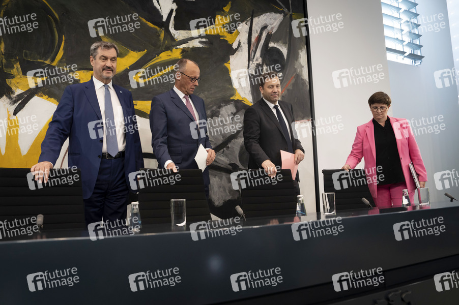 Markus Söder, Friedrich Merz, Lars Klingbeil und Saskia Esken bei der Pressekonferenz nach der ersten Sitzung des Koalitionsausschusses von Union und SPD im Kanzleramt. Berlin, 28.05.2025