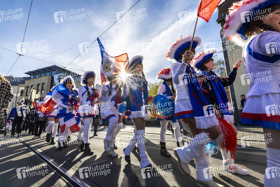 Die Tanzgarden beim Start des Erfuter Karnevals mit einem Mini-Umzug von ca. 2000 Erfurter Karnevalisten vom Hotel Radisson Blu über den Anger zum Fischmarkt vors Rathaus. Erfurt, 11.11.2022
