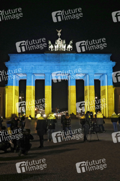 Berlin setzt ein Zeichen der Solidarität mit der Ukraine angesichts des sich immer weiter zuspitzenden Konflikts mit Russland. Von 18.45 Uhr bis Mitternacht ist das Brandenburger Tor in den ukrainischen Nationalfarben - blau und gelb - angeleuchtet. Berlin, 23.02.2022