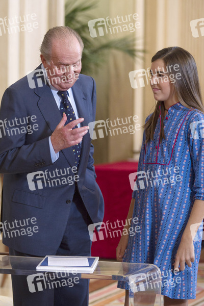 König Juan Carlos empfängt die Gewinner des 'Qué es un Rey para ti' Schulwettbewerbs im Zarzuela Palast, Madrid