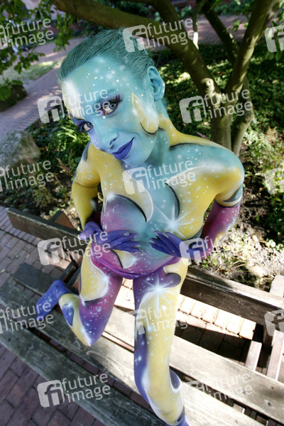 Bodypainting und Fotoshooting mit Model Sarah am Tag der offenen Tür der Meisterschule Justus-von-Liebig-Schule, Abteilung Floristik in Hannover-Ahlem. Künstler: Jörg Düsterwald