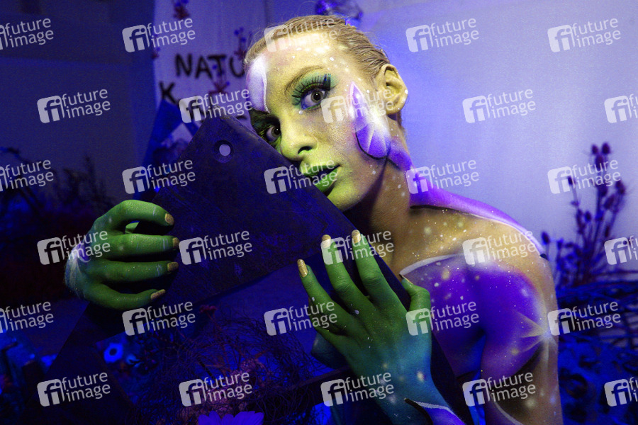 Bodypainting und Fotoshooting mit Model Sarah am Tag der offenen Tür der Meisterschule Justus-von-Liebig-Schule, Abteilung Floristik in Hannover-Ahlem. Künstler: Jörg Düsterwald
