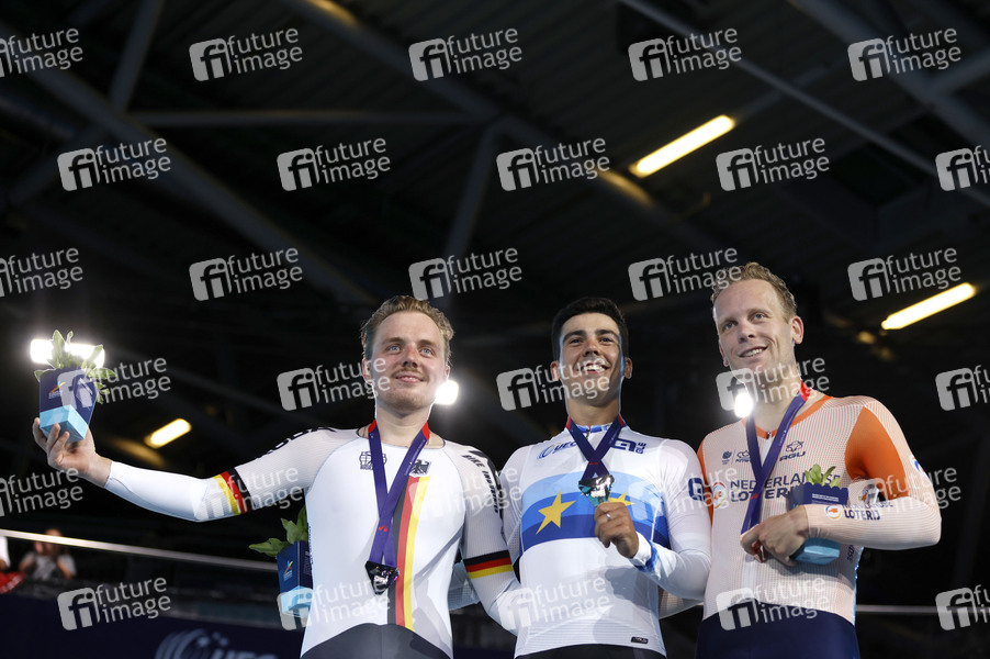Moritz Malcharek, Iuri Leitao und Roy Eefting bei der Siegerehrung Scratch 15km Männer bei den European Championships 2022 im Bahnradsport in der Messe München. München, 13.08.2022