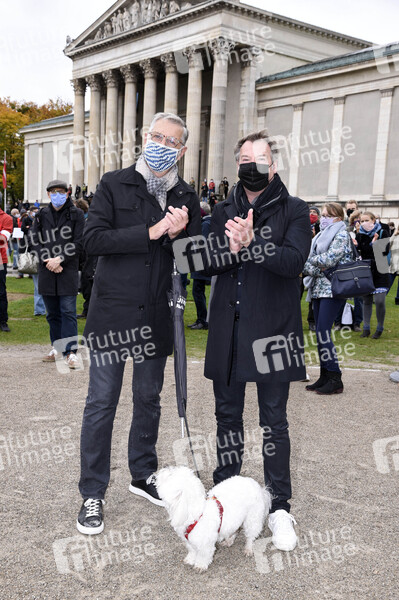 Patrick Lindner mit Ehemann Peter Schäfer und Hund Obelix bei der Kundgebung 'Aufstehen für Kultur' auf dem Königsplatz. München, 24.10.2020