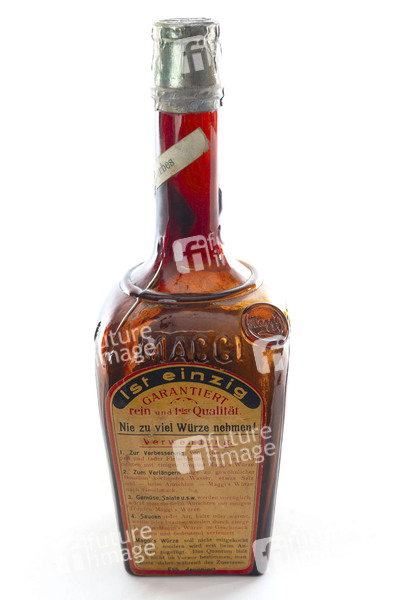 Maggi ist ein nach seinem Gründer Julius Maggi benanntes Schweizer Unternehmen der Lebensmittelindustrie, das vor allem für Instantsuppen, Brühwürfel, Flüssigwürze, Fertigsaucen und Fertiggerichte bekannt ist. Im Bild eine historische Flasche Maggi Würze. (Symbolfoto, Themenfoto)