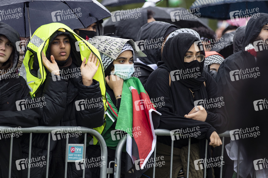 Tausende Menschen bei einem Protestmarsch, organisiert von pro-palästinensischen Organisationen. Viele Teilnehmer trugen Palästina-Fahnen und 'Free Palestine'-Banner. Ein Sprecher der Gruppe forderte die britische Regierung auf, ihre militärische, diplomatische und finanzielle Unterstützung für Israel umgehend einzustellen. London, 21.03.2021