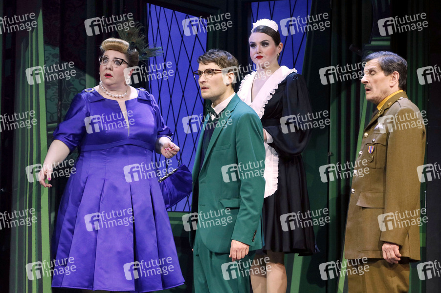 Mackie Heilmann, Matthias Britschgi, Johanna Asch und Jörg Seyer bei der Fotoprobe zum Theaterstück 'Cluedo - Das Mörderspiel' in der Komödie am Kurfürstendamm im Theater am Potsdamer Platz. Berlin, 14.03.2024
