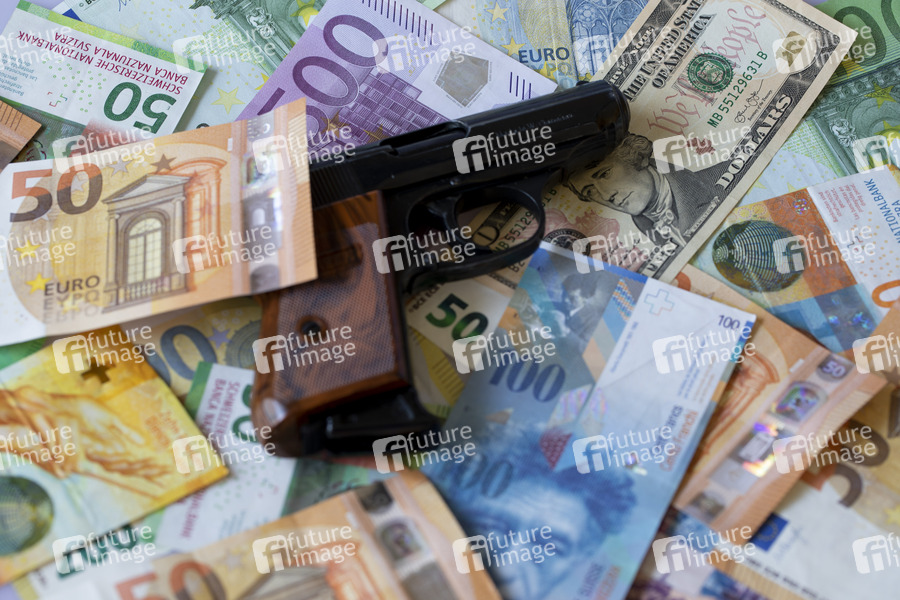 EURO, Schweizer Franken und Dollar Banknoten mit Pistole
