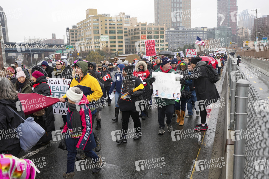 Über 300 Stadtarbeiter und andere protestieren mit einem Marsch über die Brooklyn Bridge, gegen die Ankündigung der Stadt, dass kommunale Angestellte ohne Covid-19-Impfung bis zum Ende der Woche entlassen würden. New York, 07.02.2022