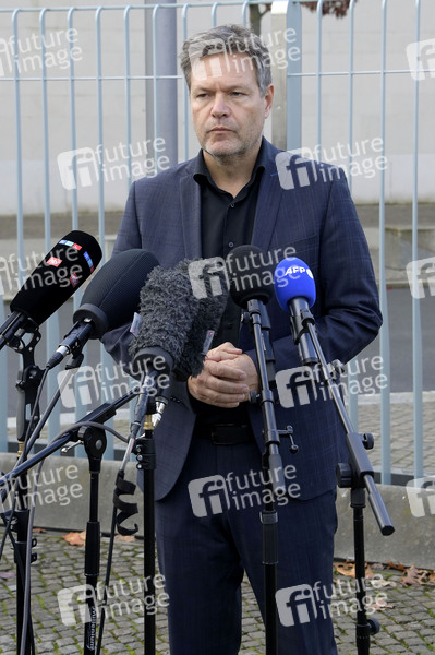 Robert Habeck bei einem Pressestatement zum Investitionsprüfverfahren zum geplanten Verkauf der Chip-Fertigung des Dortmunder Unternehmens Elmos und der Firma ERS Electronic an chinesische Firmen vor dem Bundeskanzleramt. Berlin, 09.11.2022