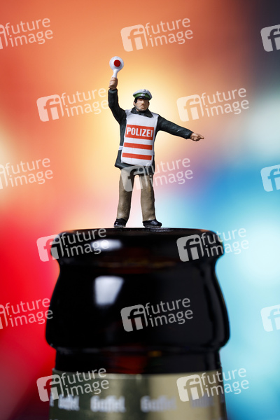 Ein Polizist steht oben auf einer Bierflasche