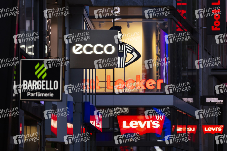 Markenlogos leuchten im Abendlicht auf der Schildergasse. Köln, 19.06.2019