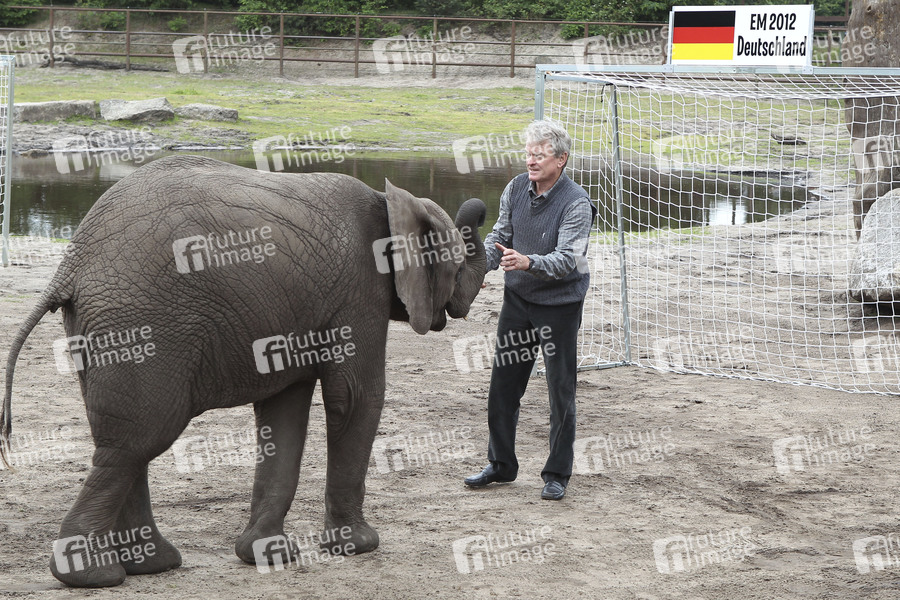 Start der Fan Fun Runde mit Elefantendame Nelly im Serengeti-Park, Hodenhagen. Gemeinsam mit Sepp Maier tippte Sie heute für das erste Spiel der deutschen Fußballnationalmannschaft gegen Portugal