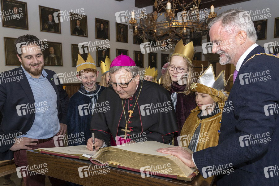 Bischof Franz-Josef Bode, Sternsinger und Oberbürgermeister Wolfgang Griesert beim Eintrag ins Goldene Buch der Stadt Osnabrück bei der bundesweiten Eröffnung der 62. Aktion Dreikönigssingen unter dem Motto 'Segen bringen, Segen sein. Frieden! Im Libanon und weltweit' im Rathaus. Osnabrück, 28.12.2019