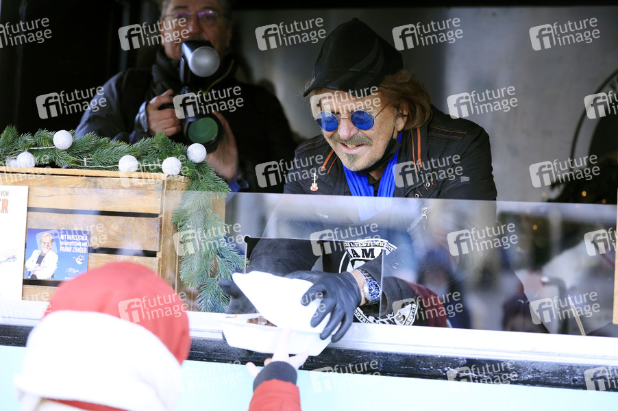 Frank Zander bei der Spendenscheckübergabe an den Caritas-Foodtruck und der Verteilung von Essen und Geschenken aus dem Food Truck an Obdachlose und Bedürftige am Alexanderplatz. Berlin, 02.12.2021