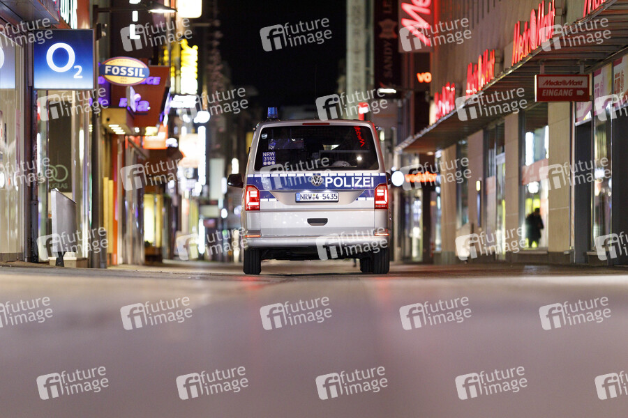 In Köln gelten seit dem 17.04.2021 um 0 Uhr Ausgangsbeschränkungen. Das Verlassen der Wohnung ist dann in der Zeit von 21 Uhr bis 5 Uhr fast ausnahmslos verboten. Die Beschränkungen beschloss der Krisenstab der Stadt Köln am Freitag. Ordnungsamt und Polizei kontrollieren die nächtlichen Straßen wie die Einkaufsstraße Hohe Straße im Bild. (Themenbild, Symbolbild) Köln, 17.04.2021