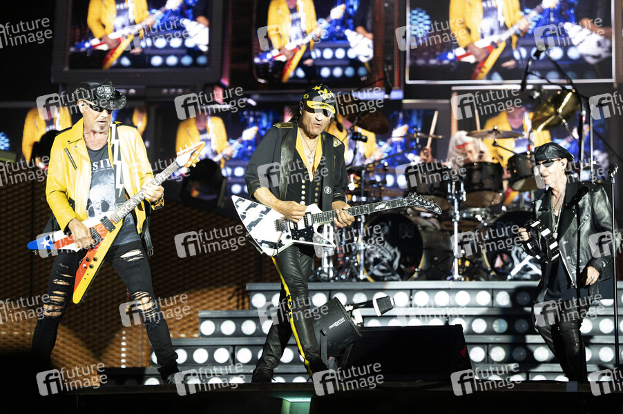 Rudolf Schenker, Matthias Jabs, Mikkey Dee und Klaus Meine von den Scorpions live bei der Konzertreihe 'Moon&Stars 2025' auf der Piazza Grande. Locarno, 12.07.2025
