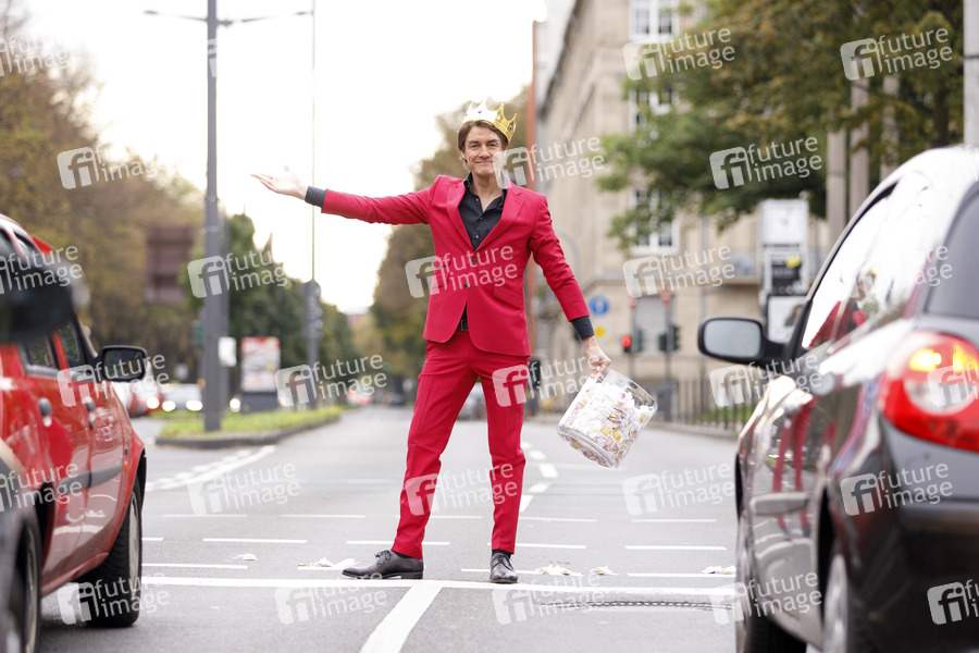 Matze Knop macht Passanten und Autofahrer an der Ampel am Ubierring auf sein neues Programm 'Matzeknopien' aufmerksam. Köln, 11.10.2019