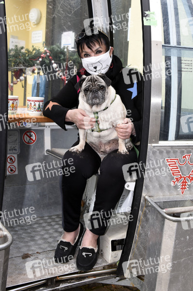Uschi Ackermann mit Hund Willy beim Fototermin zur Masken- und Gondelspende in der Medizinischen Kleintierklinik der Ludwig-Maximilians-Universität (LMU). Frauchen und Herrchen dürfen aufgrund der aktuellen Situation ihr erkranktes Tier nicht mit in die Klinik begleiten. Sie müssen draußen bleiben! Damit sie nicht frieren, stellt MilchHäusl-Besitzer Axel Bansemir der Medizinischen Kleintierklinik zwei seiner beheizbaren Ski-Gondeln gratis über die Wintermonate zur Verfügung. Uschi Ackermann hat ihren Mops Willi in der Medizinischen Kleintierklinik in Behandlung und testet die kuschelig warmen Gondeln mit einer Tasse Tee. Uschi Ackermann trägt eine Maske, mit cooler Hunde-Illu und dem Klinik-Logo. Sie hat der Klinik 100 tierisch bedruckte Stoffmasken gespendet. München, 21.12.2020