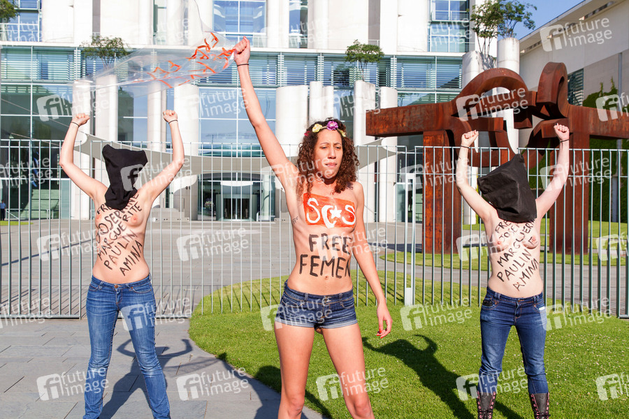 FEMEN-Aktivistinnen protestieren vor dem Bundeskanzleramt in Berlin, anlässlich des Besuchs des tunesischen Ministerpräsidenten, für die Freilassung einer in Tunesien inhaftierten Aktivistin. Berlin, 07.06.2013