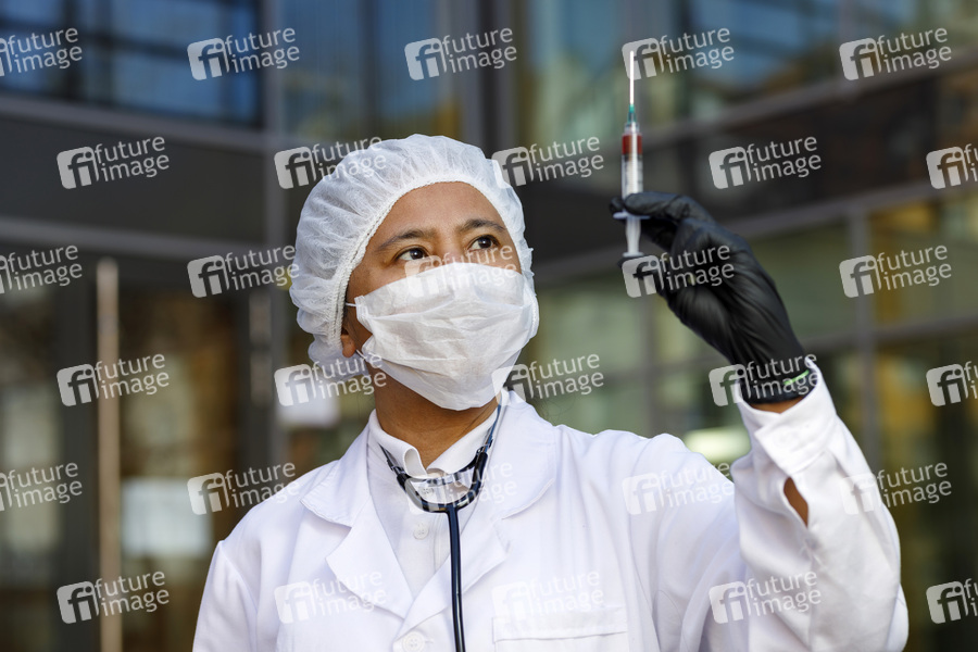 Eine Virologin posiert mit einer Spritze zur Impfung gegen das Corona-Virus. (Symbolfoto mit Model) Nürnberg, 23.04.2020