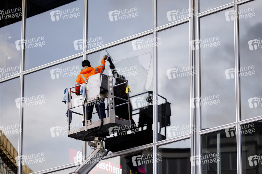 Fenster, Putzen, Fensterputzen, Fassade, Fassadenreinigung, Fassadenreiniger, Gebäudereinigung, Gebäudereiniger, Arbeitssicherheit, Arbeitsrisiko, Hubsteiger, Scheibe, Reinigen, Tariflohn, Reinigungsarbeiten, Sauberkeit, Hygiene, Seife, Seifenlauge, Fensterreiniger, Alkohol, streifenfrei, Arbeit, Kurzarbeit, Handwerk, Dienstleistung, Branchenreport, Einkommen, Durchschnittseinkommen, Einkommensrechner, Lohn, Festanstellung, Reinigungsbranche, Mindestlohn, Warnweste, Stundenlohn, Tarifvertrag, Gehalt, Gehaltsvergleich, Gehaltsrechner, Putzen, Tarifverhandlungen, Gefahr, gefährlich, Job, Höhe, hoch, Höhenangst, Gefahrenzulage, Glas, Symbolbild, Symbolfoto