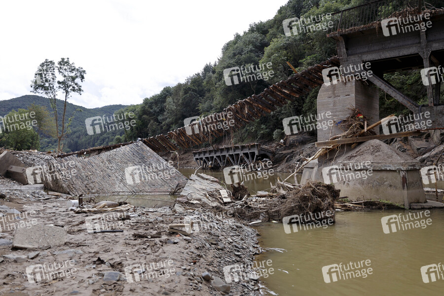Nach dem Jahrhunderthochwasser in der Eifel durch heftige Regenfälle und Dauerregen mit Überschwemmungen und Überflutungen haben die Aufräumarbeiten im Ahrtal große Fortschritte gemacht. Einheiten von Polizei, THW, Bundeswehr und Feuerwehr mitsamt vielen freiwilligen Helfern haben Straßen geräumt, Schutt und Schlamm entfernt und die Menschen versorgt. Der Wiederaufbau wird trotzdem Jahre dauern. Im Bild Flutschäden an einer Brücke zwischen Rech und Mayschoß, die durch die Flut beschädigt wurde, 08.08.2021