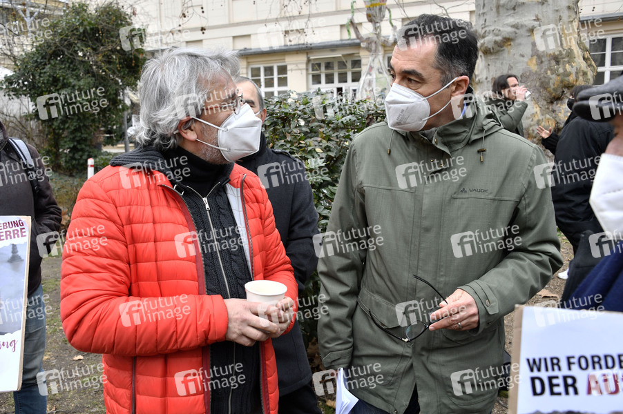 Can Dündar und Cem Özdemir bei der Pressekonferenz des KulturForum TürkeiDeutschland zur Solidarität mit den gesamten demokratischen Kräften in der Türkei, insbesondere mit inhaftierten Schriftsteller*innen, Künstler*innen, Journalist*innen, Gewerkschafter*innen und Politiker*innen vor dem Maxim Gorki Theater. Berlin, 23.03.2021