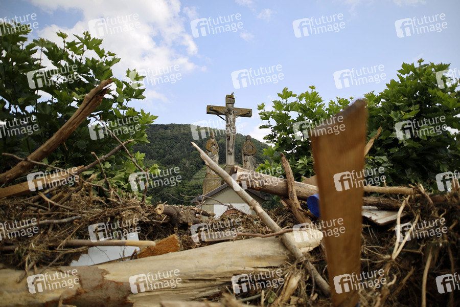 Nach dem Jahrhunderthochwasser in der Eifel durch heftige Regenfälle und Dauerregen mit Überschwemmungen und Überflutungen haben die Aufräumarbeiten im Ahrtal begonnen. Einheiten von Polizei, THW, Bundeswehr und Feuerwehr mitsamt vielen freiwilligen Helfern räumen Straßen, entfernen Schutt und Schlamm und versorgen die Menschen. Im Bild ein unbeschädigtes Kruzifix in der Ortschaft Rech, in der die Flut viele Häuser zerstörte, 22.07.2021
