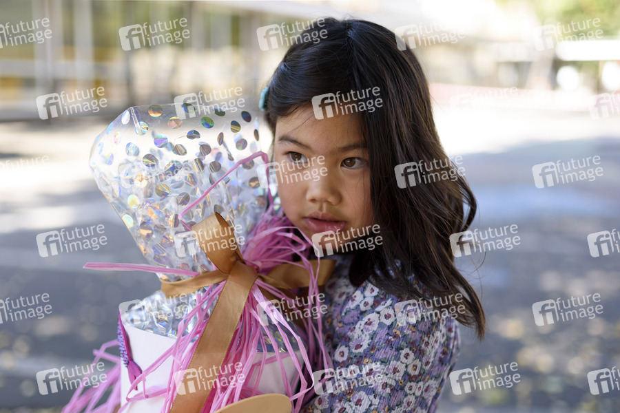 Ein junges Mädchen bekommt zum ersten Schultag bzw. zu ihrer Einschulung in die Grundschule eine Schultüte. (Model Release, Themenbild, Symbolbild) Nürnberg, 15.09.2021