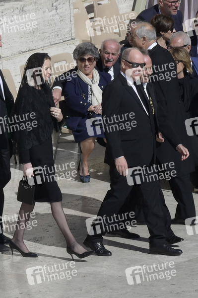 Albert II. von Monaco mit Ehefrau Charlene von Monaco bei der Trauermesse für den verstorbenen Papst Franziskus auf dem Petersplatz. Vatikanstadt, 26.04.2025
