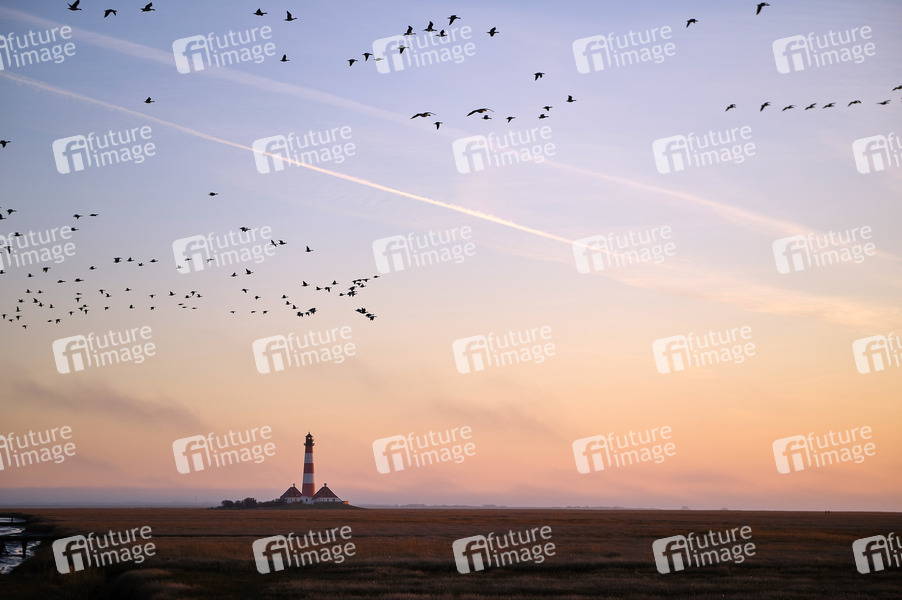 Vögel am Leuchtturm Westerheversand auf der Halbinsel Eiderstedt. Westerhever, 27.02.2021