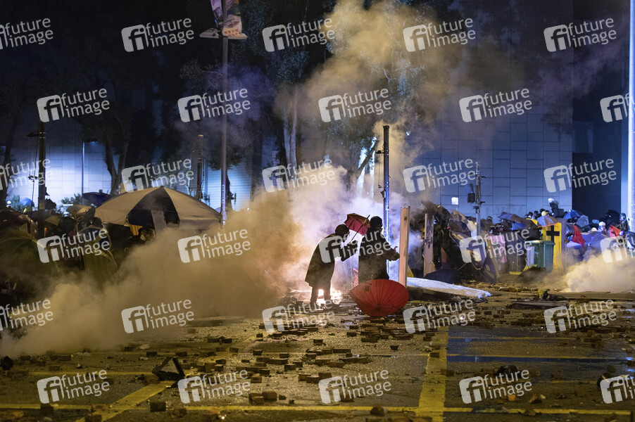 Tränengaswolken umhüllen Demonstranten auf der Cheong Wan Road