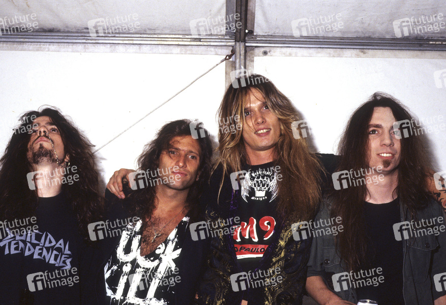 Rachel Bolan, Rob Affuso, Sebastian Bach und Scotti Hill von Skid Row auf dem Monsters of Rock Festival 1992 im Donington Park. Donington, 22.08.1992