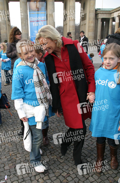 UNICEF Fototermin mit Sabine Christiansen und 90 Schülern und Schülerinnen der Internationalen Schule Berlin vor dem Banner 'A Call From Berlin: Children First - Kinder haben Rechte' am Brandenburger Tor
