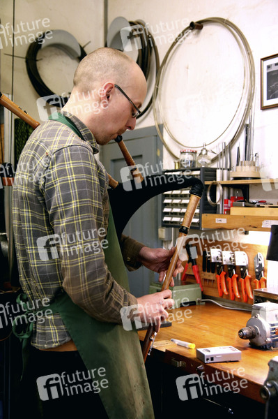 Aussterbende Zunft, Werkstatt, Instrumentenbau, Dudelsack, Sackpfeife, Holzblasinstrument, Sessionprotz, Schäferpfeife, Spielpfeife, Säckpipa, Säckpipor, Dudelsackmanufaktur, Handwerk, Werkzeuge, Werkzeuge, Herstellung, Hersteller, Innung, Zunft, Zünfte, Handwerkskunst, Handarbeit, Musik, Musikinstrument, Pfeife, Pfeifen, Kunsthandwerk, Symbolfoto, Symbolbild