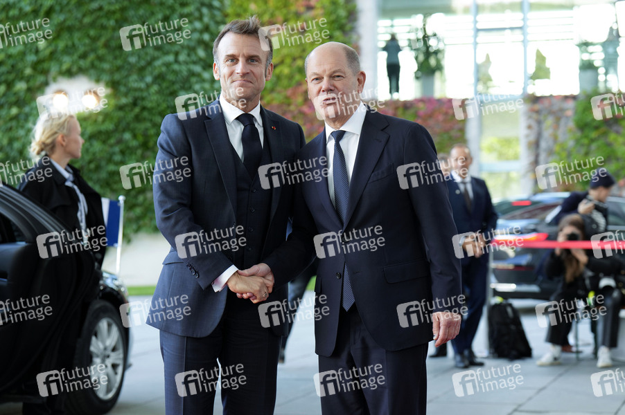 Emmanuel Macron und Olaf Scholz bei der Ankunft zum QUAD Treffen anlässlich des Besuchs des amerikanischen Präsidenten Joe Biden im Bundeskanzleramt. Berlin, 18.10.2024