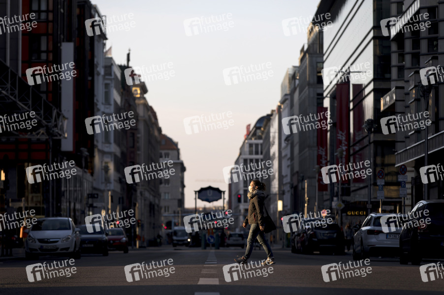 Fußgängerin mit Mundschutz während der Coronakrise. Berlin,. 25.03.2020