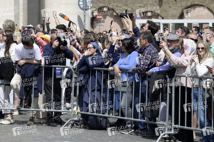 Trauernde Menschen nach dem Tod von Papst Franziskus auf dem Petersplatz. Rom, 21.04.2025