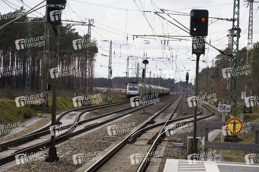 Güterbahnhof Fangschleuse mit abgestelltem Güterzug. Die Erweiterungspläne für die Fabrik des Elektroautobauers Tesla in Grünheide (Oder-Spree) bei Berlin sind bei einer Einwohnerbefragung mehrheitlich auf Ablehnung gestoßen. Doch das Votum ist letztlich nicht bindend. Tesla will neben dem 300 Hektar großen Werksgelände einen Güterbahnhof, Lagerhallen und einen Betriebskindergarten errichten. Dafür müssten aber rund 100 Hektar Wald gerodet werden. Das ist umstritten. Es gibt Befürworter der Pläne, aber auch Ablehnung einer Tesla-Erweiterung (Quelle: rbb24). Grünheide, 23.02.2024