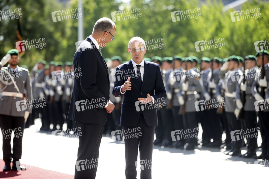 Friedrich Merz und Luc Frieden beim Empfang des Premierministers von Luxemburg mit militärischen Ehren zu einem gemeinsamen Gespräch mit anschließendem Pressestatement im Bundeskanzleramt. Berlin, 01.07.2025