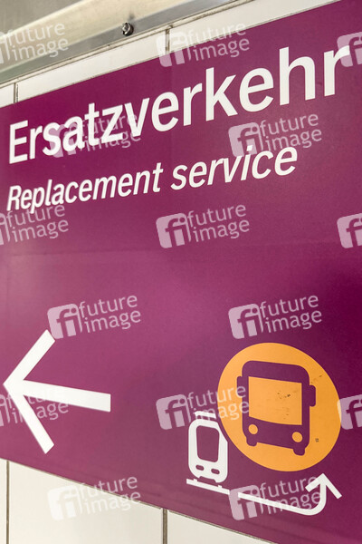 Im Rahmen von Streckenmodernisierungen oder Störungen des Eisenbahnbetriebes, richtet die Bahn einen Schienen-Ersatzverkehr mit Bussen ein. Hierdurch verlängert sich die Reisezeit oft erheblich zum Beispiel durch Verkehrsstaus auf den Straßen. Die Bushaltestellen zum Schienen-Ersatzverkehr werden in den Bahnhöfen durch auffällige Hinweisbanner und Schilder hingewiesen. (Symbolfoto, Themenfoto) Köln, 17.05.2025