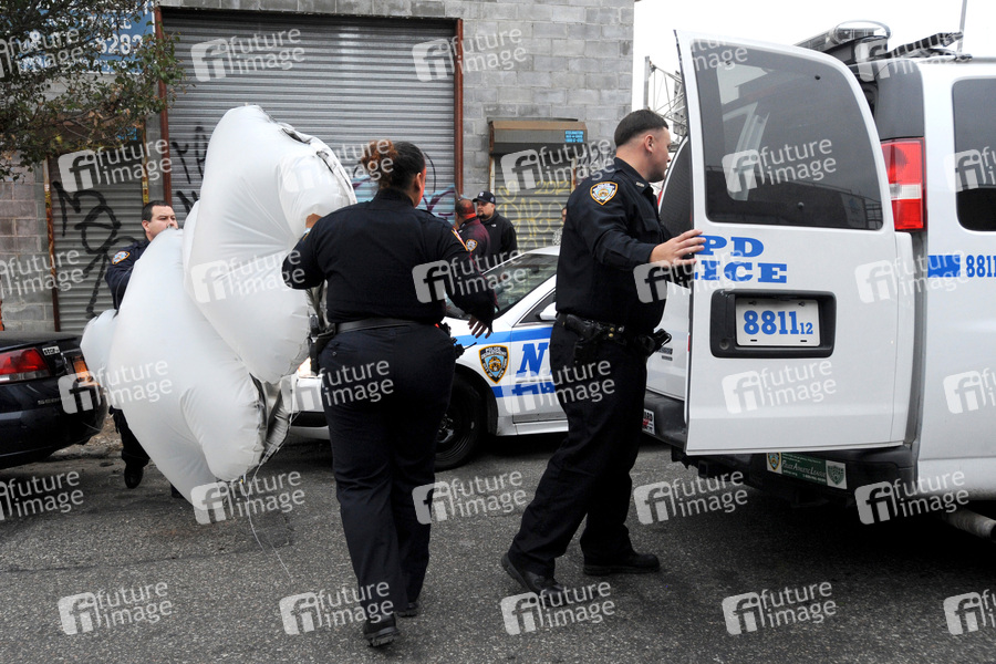 Banksy Graffiti-Ballon Installation in Long Island City, Queens als Teil seiner einmonatigen Aktion 'Better out than in'. Die Polizei verhaftet Verdächtige, die angeblich versuchen das Kunstwerk zu stehlen. New York, 31.10.2013