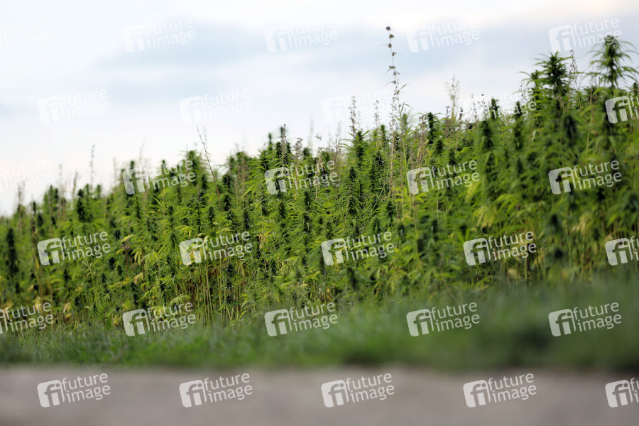 Eine Cannabis-Plantage mit Nutzhanf für Textilien und Hanföl bei Frechen. Nutzhanf oder Industriehanf umfasst alle Sorten des Hanfs (Gattung Cannabis), die zur kommerziellen Nutzung angebaut werden abseits von seiner Verwendung als Rauschmittel oder Arzneimittel. Dabei handelt es sich vor allem um Sorten der Hanfart Cannabis sativa und dessen Kulturform Cannabis sativa var. (Themenbild, Symbolbild) Frechen, 13.07.2021
