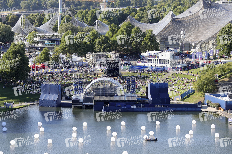 Blick aud den Olympiapark bei der Pressekonferenz zur Eröffnung der 2. European Championships 2022 im Heimat Roof auf dem Olympiaberg. München, 10.08.2022