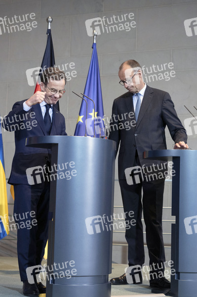 Ulf Kristersson und Friedrich Merz bei der Pressekonferenz nach der Unterzeichnung der bilateralen deutsch-schwedischen Innovationspartnerschaft im Bundeskanzleramt. Berlin, 19.11.2025