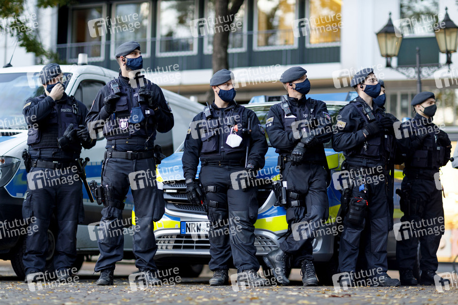 Polizisten müssen im Polizeidienst auf Demos eine Maske tragen - hier auf einer Demonstration gegen die Corona-Maßnahmen von Stadt Köln und Bundesregierung auf dem Rudolfplatz. Köln, 31.10.2020